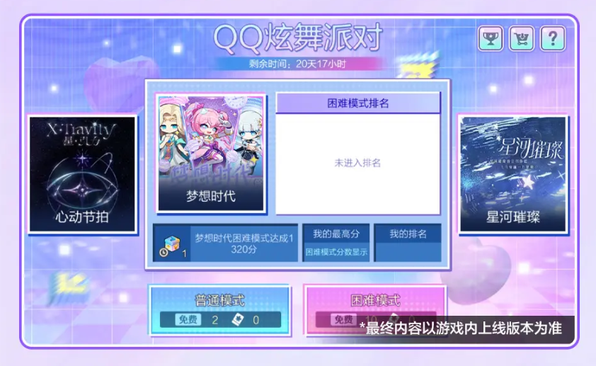备受期待的“QQ炫舞派对”活动也将于10月22日至11月12日期间限时开启。该玩法以QQ炫舞三首经典曲目为基础,设置普通与困难两种挑战模式。每日可参与普通模式两次,困难模式则提供十次挑战机会。成功通关即可领取当日奖励,高分表现还能解锁成就并进入排行榜,赢取额外荣誉奖励。
