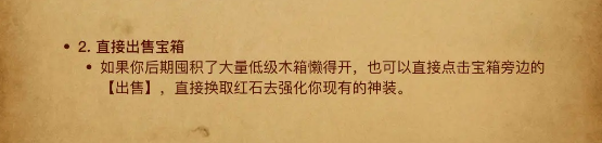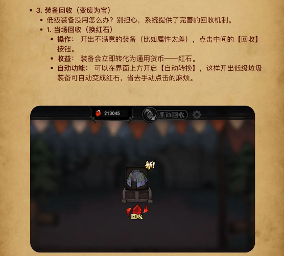 2、善用“回收”:不要让背包被垃圾装备塞满。开箱时养成习惯,属性差的直 接【回收】换红石,红石是永远不嫌多的资源。