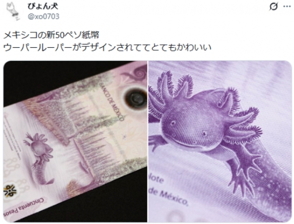 许多墨西哥与日本网友热情向她科普,并分享说墨西哥50比索纸币上就印有墨西哥钝口螈的图案,十分可爱。甚至有人调侃道:“因为它太可爱了,大家舍不得把新钞票花掉,反而让纸币流通变慢了。”