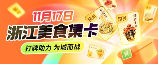 ·卡面有讲究:卡牌包含 1 张稀有「浙江省卡」和 11 张各地市「城市卡」,每张卡都印着家乡的特色美食,人情味满满!