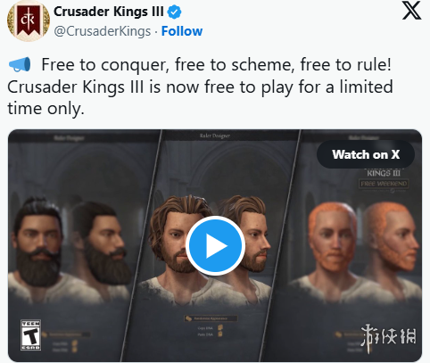 由Paradox Development Studio开发、Paradox Interactive发行的《十字军之王III》(Crusader Kings III),宣布自即日起至北京时间11月4日凌晨2:00,在Steam平台开放免费游玩。游戏目前也在PC(Microsoft Store)、PS5及Xbox Series X|S等平台发行。