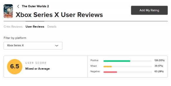 黑曜石的RPG大作《 天外世界2 》已于10月29日正式发售,随着越来越多的玩家通关游戏,本作在M站的玩家评分也已出炉。截稿之前,共收录228条用户评测,55%玩家打出好评,17%玩家打出中评,63%的玩家打出中评。