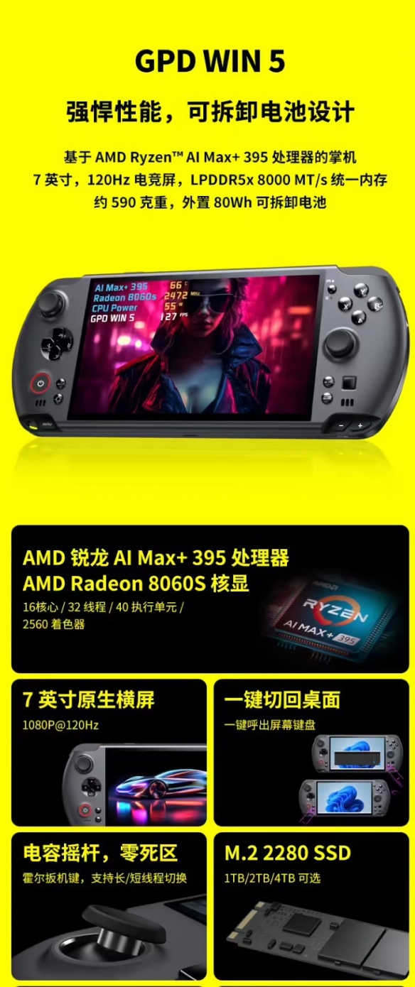 GPD WIN 5 PC掌机现已新增 128GB内存 + 4TB硬盘版本,配置与 64GB+4TB 版一致,均搭载锐龙 AI Max+ 395 处理器,配备 7 英寸 120Hz 电竞屏,预售价16999元。