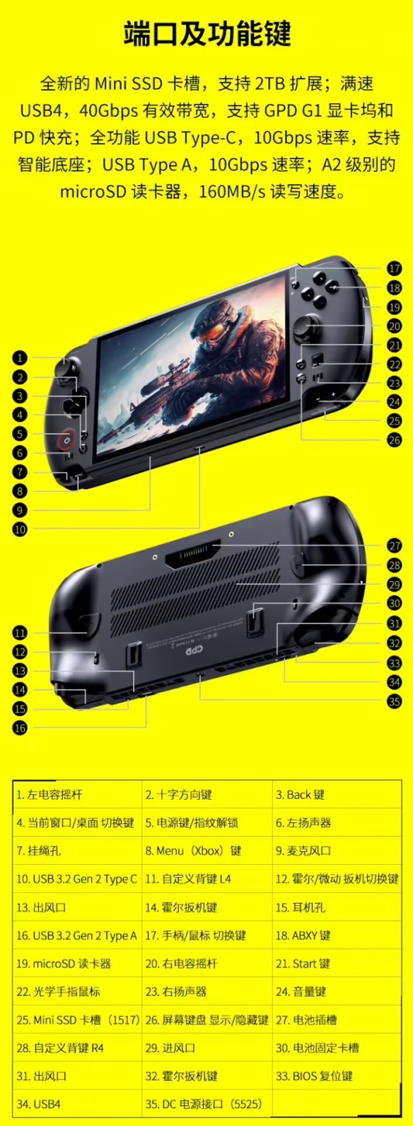 扩展与功能:内置 2280 硬盘插槽(兼容单面 M.2 PCIe Gen4 固态硬盘)、Mini SSD 插槽及 MicroSD 卡槽,支持双模式扩容;配备 FPS 专用电容摇杆(8000Hz 采样率,理论零漂移)、霍尔扳机键(长/短行程切换)及双震动马达(延迟 2.3ms),适配赛车、动作、射击等多类游戏。