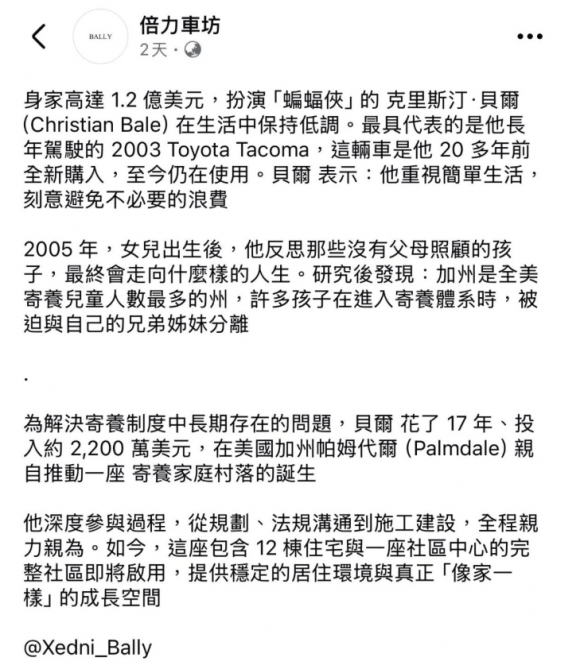 真正的“黑暗骑士”在现实世界持续行善!以“自我折磨式演技”闻名的克里斯蒂安·贝尔,在《蝙蝠侠》三部曲等作品中塑造了无数深入人心的角色。然而戏外,这位身家过亿的巨星却过着极其低调的生活,甚至至今仍驾驶着20多年前购买的Toyota Tacoma。这种对简单生活的坚持,与他角色中常表现的挣扎与责任形成了奇特的共鸣。
