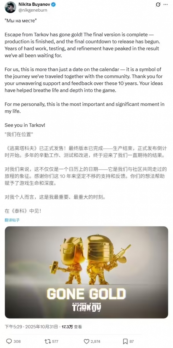 《逃离塔科夫》开发商Battlestate Games总监Nikita Buyanov今日正式宣布,游戏最终版本已制作完成,1.0正式版将于北京时间11月15日在Steam平台发售,标志着这款备受瞩目的战术生存游戏结束长期测试阶段。