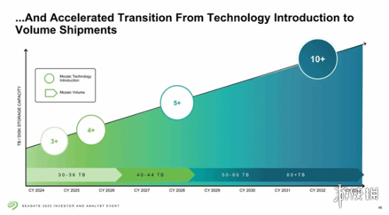 根据希捷最新的技术路线图,2030年前实现50至60TB的容量是可行的,而80TB容量则需要单碟10TB以上的存储密度,预计将在2031年至2032年间实现。