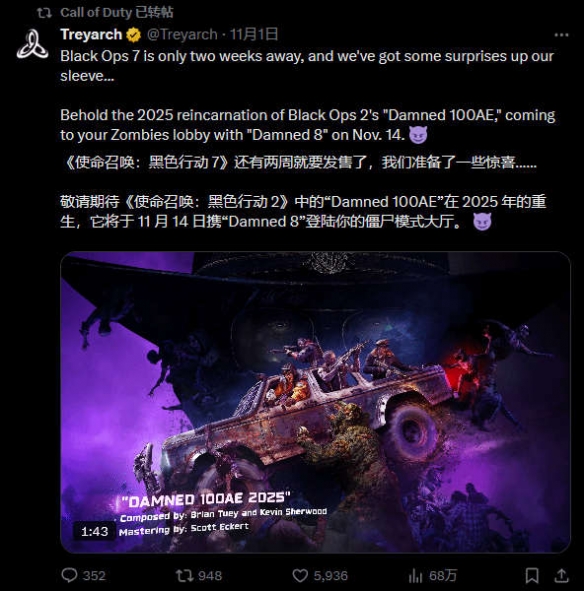 此前,爆料人TheGhostofHope曾称游戏可能早于原定日期发售,引发玩家关注。但随后,另一位知名《使命召唤》消息来源CharlieIntel明确表示,动视代表已向其确认,发售日并未变动,也不会提供抢先体验。游戏开发商Treyarch也于近期再次强调了11月14日的发售安排。