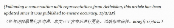 文章开头随后添加了更新说明,称已与动视沟通并修正内容,以确保信息准确。