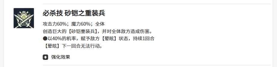 那么亚雷克德拉他在必杀技效果上面是砂铠之重装兵,这个技能的话其实相对来说百分比可能没有大家想象中那么高,因为在攻击力以及魔力上面达到的百分比都只有60%,但是相对来说这是一个全体输出类型的技能,所以覆盖范围可以说是非常高的,在使用的情况下,会带来一个巨大的重装兵,这个重装兵将全体的敌人都纳入他的伤害范围之内,此时在造成输出之后,还会有40%的概率,会给敌人带来一个很好的晕眩控制,所以相对来说,必杀技虽然带来的输出百分比比较低,但毕竟是一个全体输出技能,而且还可以同时跟上面的技能一起生效,带来明显的效果。