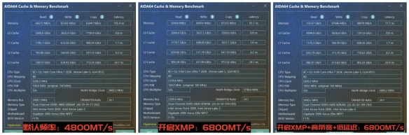 通过AIDA64内存测试的数据来看,我们这块内存CUDIMM默认的带宽速率是4800MT/s,初始带宽比较一般,默认时序CL40-39-39-77上的延迟也高达105.4ns。紧接着开启内存自带的XMP超频后,内存频率直接上升至6800MT/s,时序也变为CL32-42-42-109,不仅带宽上提升明显,传输延迟也降低至83.1ns。最后,我们开启Intel 200S Boost与D5黑科技2.0中的“高带宽”与“低延迟”,读写速率也是得到了进一步地提升,内存延迟降也进一步降低至77.7ns,对比默认频率,读取速度提升65%、写入速度提升49%、复制速度提升55%,内存延迟也同比降低了26%。
