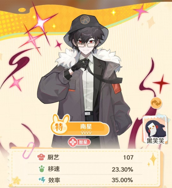 南星的核心价值主要体现在中后期的技能上。宇宙小爆发在入座率达到80%的时候触发,给自身提供高额移速和效率加成,持续时间长,在高峰期可以迅速缓解出餐压力,避免因为供应不足而造成的评分下降。同时“厨艺交响”直接给全体店员提供固定的厨艺加成,在大型活动或者高难度经营目标中效果更加明显。除此之外,该角色在超级厨王秀和商务聚会等玩法里,对智星特质店员进行的专项强化,使得他在特定的阵容中具有不可替代性。