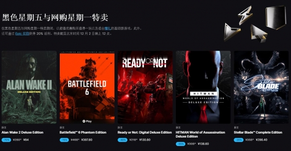 此次“黑色星期五与网购星期一特卖”活动期间,多款游戏的高级版本在包含游戏本体的基础上,额外附赠扩展包或数字专属内容。活动周期自即日起,持续至美国东部时间12月2日11时结束, 最高折扣幅度可达80%。