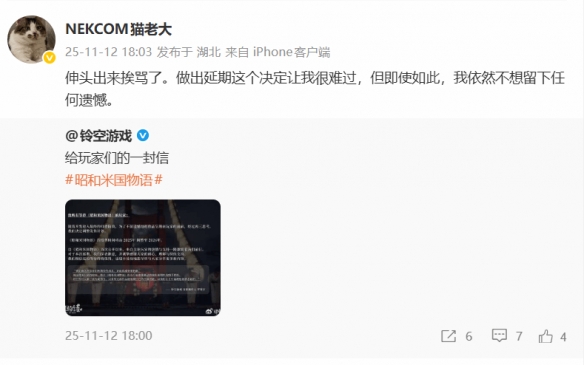 猫老大表示:“伸头出来挨骂了。做出延期这个决定让我很难过,但即使如此,我依然不想留下任何遗憾。”