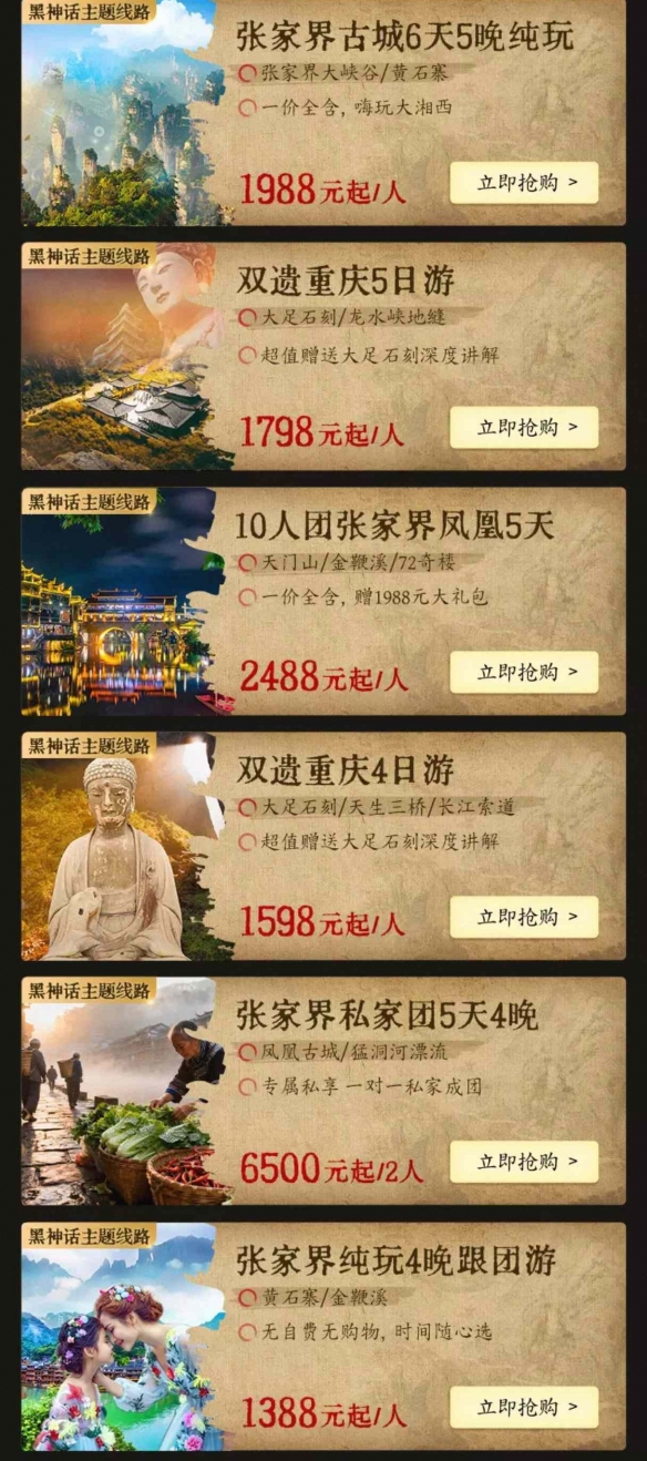 飞猪平台结合《黑神话:悟空》中西游记文化背景以及世界观设定,同步精心策划并推出了多条主题旅行线路。这些线路旨在引领用户在现实世界中追寻神话足迹,开启一场“沉浸式跟随《黑神话:悟空》的西行探秘之旅”。