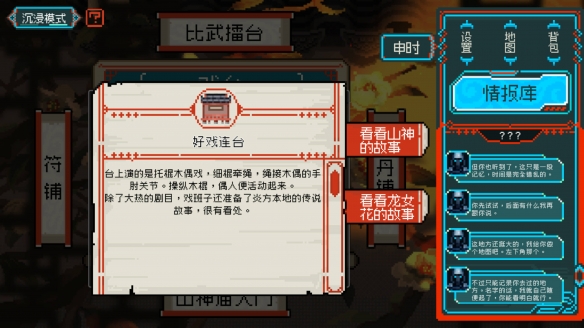 《龙女花》是一款2D像素风文字悬疑冒险游戏。你被困在祭山神会当日,陷入无尽的死亡轮回,你需要在有限的时间内探索村子寻找线索, 结识村中奇人,了解各方轶事, 揭开关于“龙女花”的真相。收集关键器物,完成神秘仪式,结束这无尽的死亡循环。