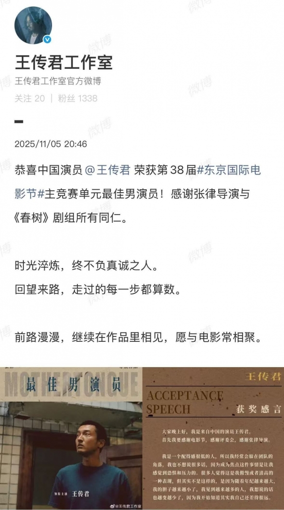 喜讯传出后,“#王传君东京电影节影帝#”迅速登上社交媒体热搜榜首。当晚,王传君工作室通过官方账号发文致贺:“王传君荣获第38届东京国际电影节主竞赛单元最佳男演员,感谢张律导演与《春树》剧组所有同仁。”
