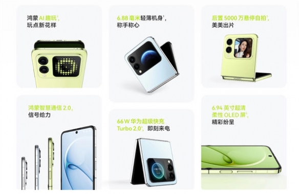 新机在延续前代设计语言的基础上,新增天青蓝与羽砂黑两款配色,并出厂预装最新的鸿蒙OS 5.1操作系统。其标志性的2.14英寸外屏支持通话趣显、DIY壁纸等实用功能,6.94英寸内屏则配备1-120Hz LTPO自适应刷新率与1440Hz高频PWM调光,在显示效果与护眼性能间取得平衡。