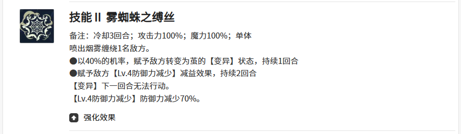 第二个技能叫做雾蜘蛛之缚丝,这个技能需要冷却3回合之后才能再一次使用,带来的攻击力以及魔力百分比是同样达到百分之百的,而且使用这个技能的时候也是对一个单体的敌人进行输出,此时的话内布拉会对目标喷出一段烟雾,这个烟雾会缠绕住一名敌方,此时会以40%的概率会将这个输出带来一个额外的状态,附加给敌人的这个状态叫做变异状态,也就是会将敌人直接转变为一个茧,后面一个回合当中,只要敌人保持在这个茧的状态里面就无法进行行动,此时还可以给敌方带来一个减益效果,这是根据目前敌方防御数值最少的一个敌人来作为他的目标,带来的防御减少效果是70%的防御数值,在减少之后,还会持续两个回合生效。