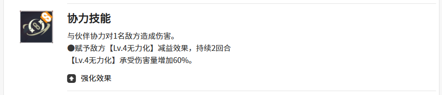 这个效果就是在内布拉使用水雾魔弹的时候,有两名分身直接出现在额外造成150%的伤害,分身的效果会持续在场上生效两个回合,所以带来的整体百分比输出还是很高的,那么大家想要用好内布拉的协力技能的话,一定要跟伙伴一起上场,此时跟伙伴协力起来就可以对一名敌人造成输出,在输出数值上面虽然不高,但是可以赋予敌方一个无力化的减益,无力化其实是可以在承受伤害量上面增加60%的数值,也是同样只是两个回合的,所以这个协力技能相对来说也是可以当做一个减益技能使用的。