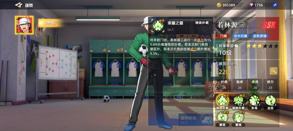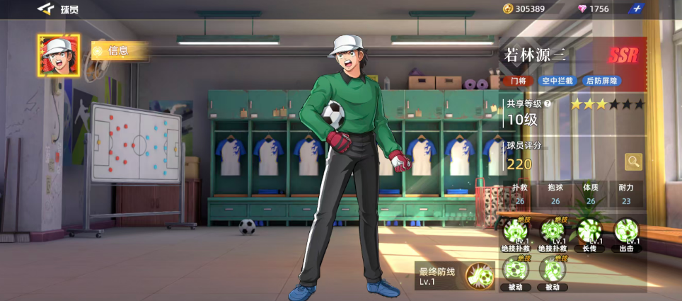 最后一个技能叫做最终防线,在比赛一开始的时候,若林源三凭借这个技能就可以获得3层【最终防线】,而且在若林源三每次扑救成功后获得1层【最终防线】,叠加到5层的时候最强,但是被进球后会移除全部层数,这里最终防线的效果就是增加若林源三16.6%扑救属性和16.6%反应属性增益哦。