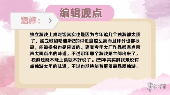 历年来从未有过独立游戏拿下年度最佳的TGA,都放了三款独游在年度最佳的提名中,说实话这远超我的预期。