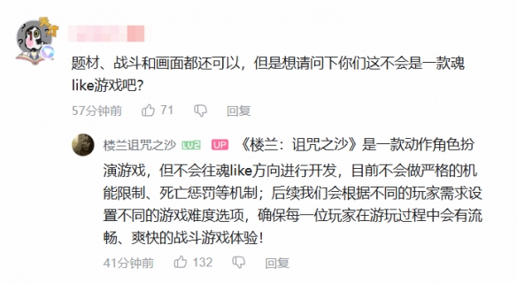 官方表示:《楼兰:诅咒之沙》是一款动作角色扮演游戏,但不会往魂like方向进行开发,目前不会做严格的机能限制、死亡惩罚等机制;后续我们会根据不同的玩家需求设置不同的游戏难度选项,确保每一位玩家在游玩过程中会有流畅、爽快的战斗游戏体验!