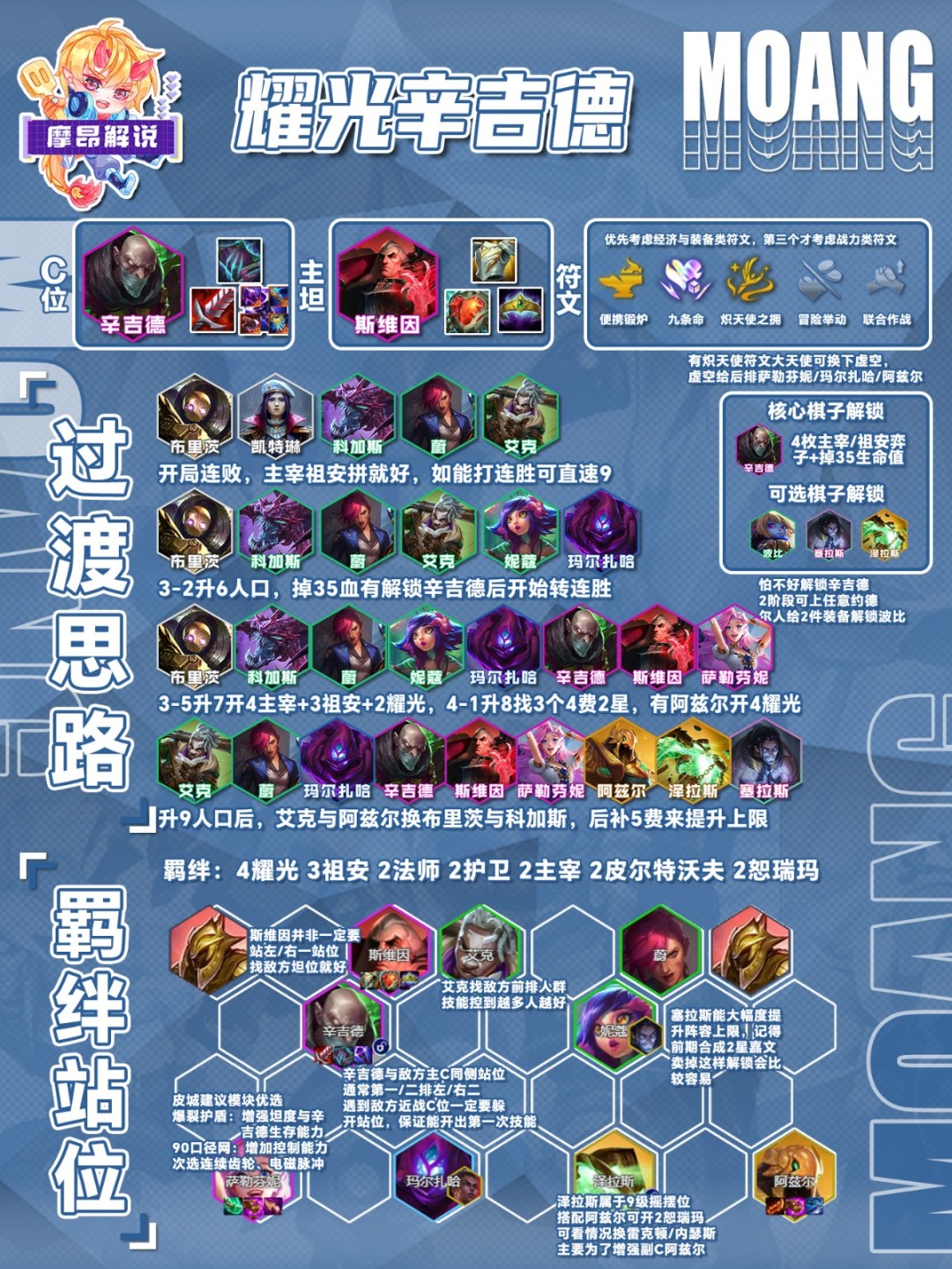 云顶之弈 S16版本 英雄联盟 传奇主题,在新赛季会增加很多新的羁绊和棋子,还有不少老羁绊,老英雄的回归,那么有不少小伙伴好奇新赛季有什么强力阵容,下面就给大家带来s16耀光辛吉德阵容推荐。