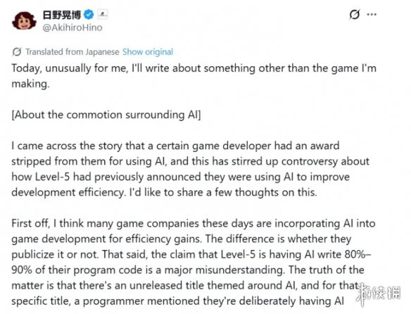 日野晃博在社交平台上阐述了他的核心观点:“它(生成式AI)可能会将我们从开发AAA游戏需要5-10年的世界,转变为我们每两年就能享受到它们的世界。” 他强调,不应简单将AI视为“邪恶”之物,而应将其作为推动行业进步的工具。他还透露,许多开发者已在实践中使用生成式AI提升效率,只是未公开其应用。