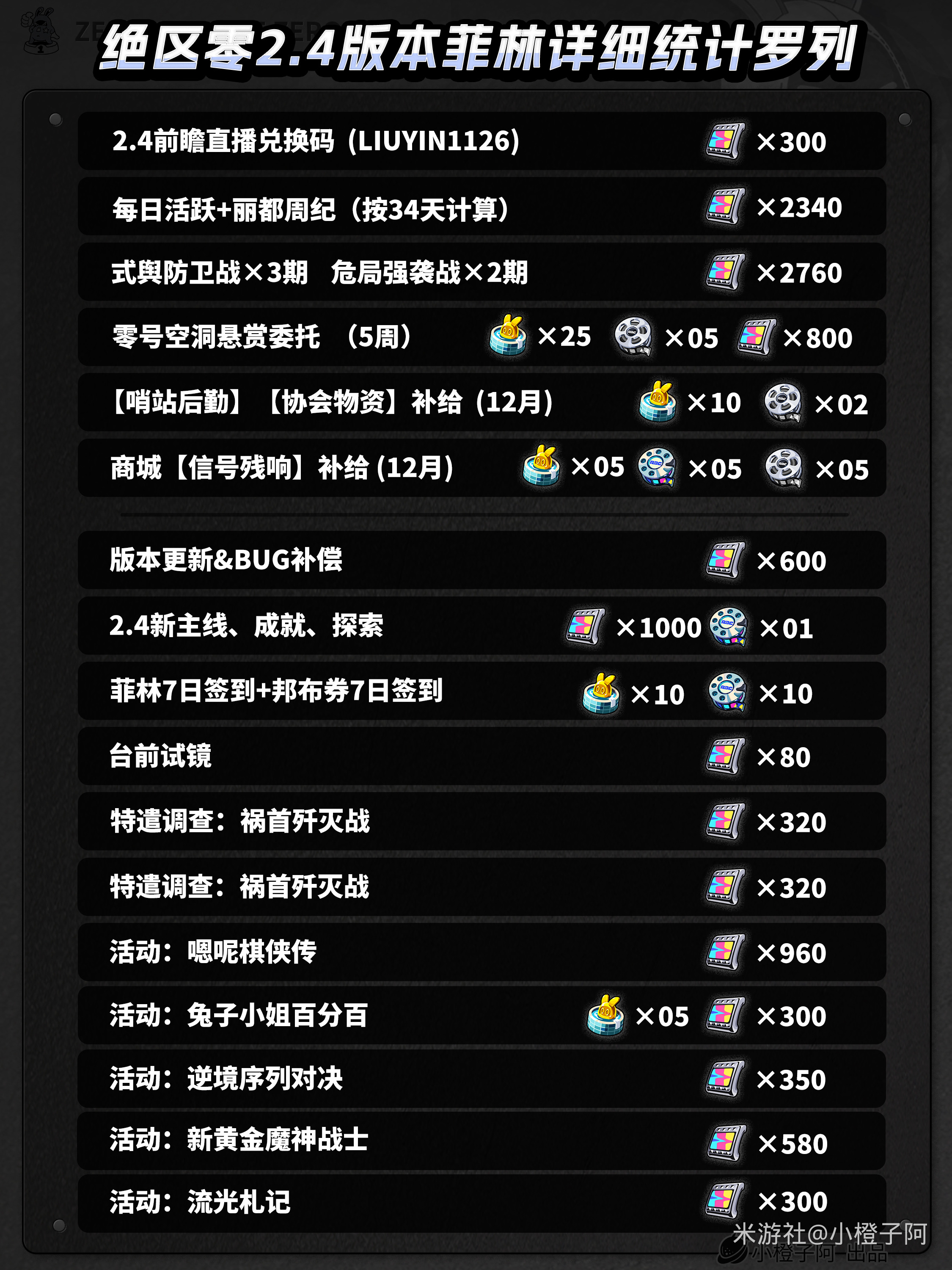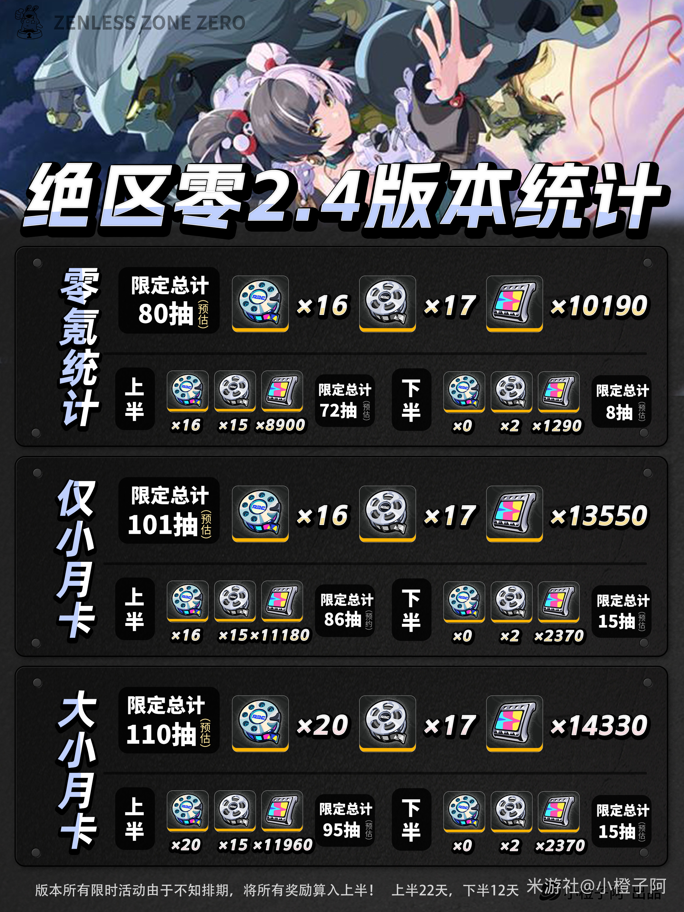 绝区零 2.4版本能有多少抽,这一篇是v2.4新版本抽数统计,整体分为总体统计与各内容版块统计,总体统计分为了:零氪、小月卡与大小月卡,方便大家根据自身需求选择查阅,本攻略适用版本:v2.4丨「将临未抵的深渊」。