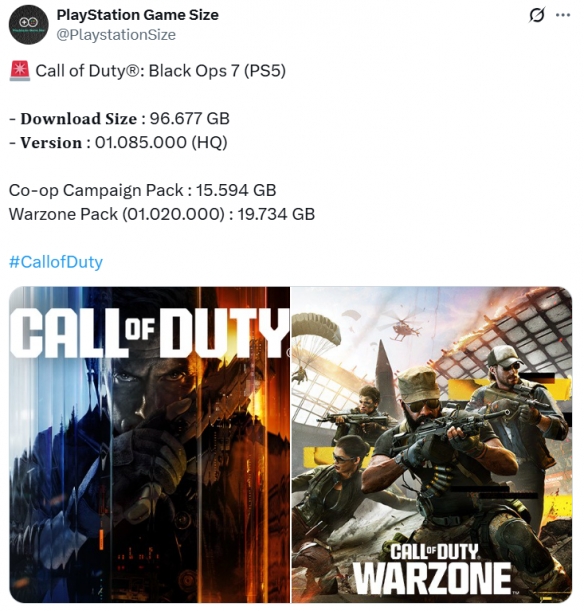 动视重磅射击大作《 使命召唤:黑色行动7 (Call of Duty: Black Ops 7)》即将在2025年11月14日正式发售。今日,推主@PlaystationSize透露了本作在PS5平台的容量大小,一起来看下吧。
