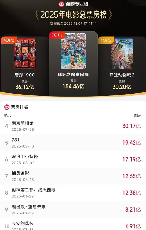 榜单数据显示,《哪吒之魔童闹海》以154.46亿元稳居榜首,国产喜剧《唐探1900》以36.12亿元位列第二。而《疯狂动物城2》则以微弱优势领先《南京照相馆》,拿下季军席位。