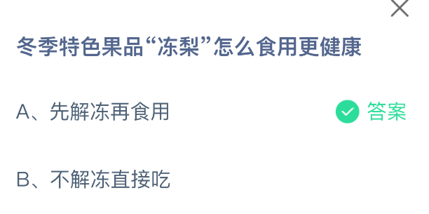 冬季特色果品“冻梨”怎么食用更健康?支付宝小鸡课堂开课啦!每天花一分钟答题赚饲料,喂喂小鸡就能贡献爱心啦!轻松又意义十足!2025年12月18日蚂蚁庄园的小鸡课堂题目正确答案是【先解冻再食用】,食用冻梨时,更健康的方式是先解冻再食用。