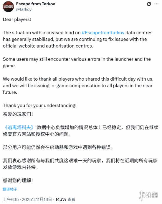 今日,《逃离塔科夫》官方发布公告称,目前服务器高负载状况已基本稳定,但相关修复工作仍在持续进行中。