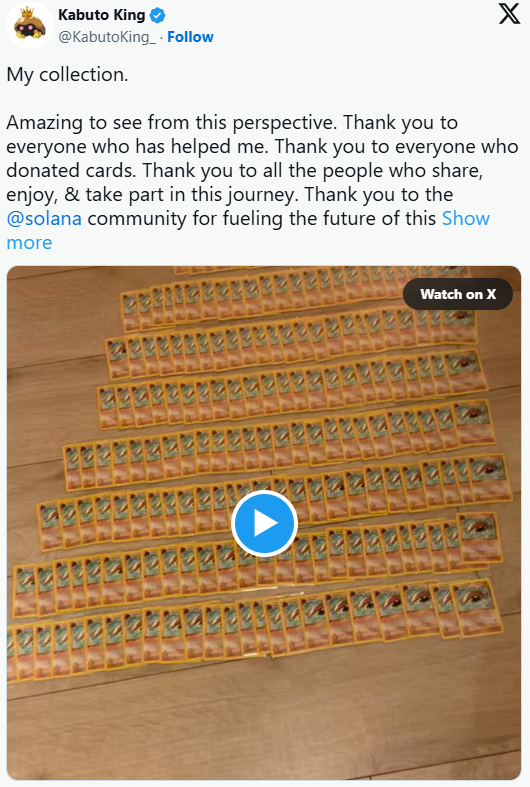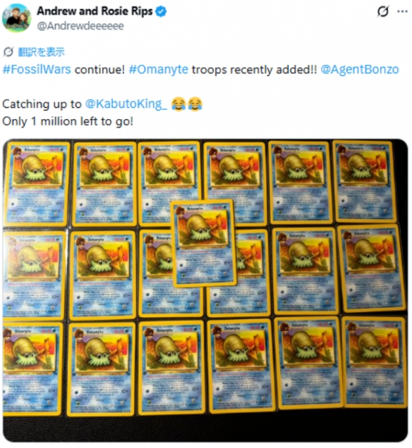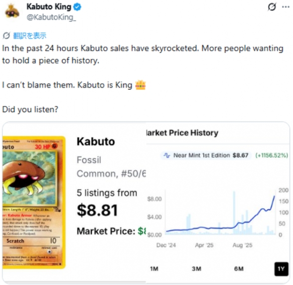 这位被网友称为“化石盔之王”的玩家Kabuto King(@KabutoKing_),专注于收藏海外版早期卡包中的“化石盔”卡牌,并且只收录印有“1st Edition”标识的初版卡。他定期在X平台上更新收藏数量,相关动态被娱乐资讯账号转发后,迅速走红。