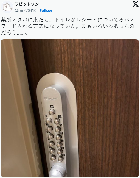 发起讨论的网友表示,他在某家星巴克发现厕所门锁改成了需要输入收据上的密码才能打开。他推测,这很可能是因为店家过去遭遇过设备损坏或不当使用等事件,才不得不采取防范措施。这则推文曝光后,迅速吸引了大量留言。多数人理解店家的用意,但也直呼“太麻烦了”。