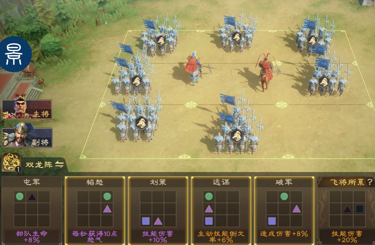 这个队伍是和张辽进行搭配,这两位一起能激活羁绊飞将所系,提升20%技能输出,兵种选择能提升暴击概率的禁军,阵法选“双龙阵”,张辽其实是吕布最为理想的副将,他提供勘破能帮助免疫技能伤;