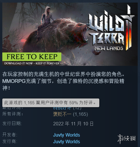 截止到发稿时为止,《荒野之地2: 新大陆》在Steam上的总评价为「褒贬不一」,一共1165篇用户评测中,好评率为59%。