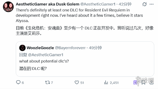 尽管距离卡普空下一部主线力作《 生化危机 安魂曲 》的正式发售还有较长一段时间,但玩家们已然将目光投向了后续DLC的相关信息。近日,知名爆料人Dusk Golem在回应网友询问时,透露了有关《生化危机9》DLC的最新动态:“目前,至少有一款《生化危机:安魂曲》的DLC正处于开发阶段。我已经多次听闻此事,并且确信其主角会是阿莉莎(Alyssa)。”