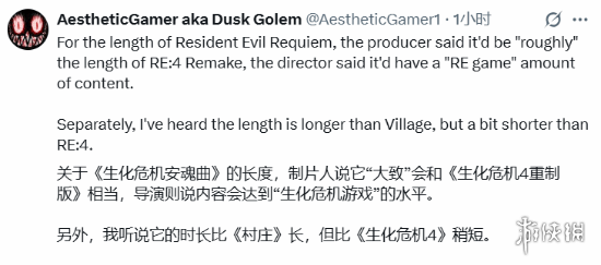 另外,Dusk Golem还透露了《生化危机9》主线流程的大致时长情况:“我了解到,它的时长会比《村庄》长一些,但比《生化危机4重制版》要短一点。”