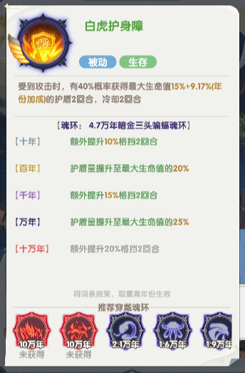 受到攻击时,有40%概率获得最大生命值15%+(年份加成)的护盾2回合,冷却2回合