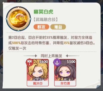 第2回合起,回合开始时35%概率触发,对敌方全体造成500%总攻击的特殊伤害,并降低15%普攻减伤3回合。仅触发一次