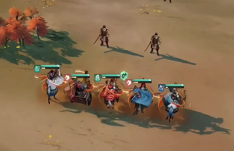 接下来就是队伍中的站位问题了。由于夏侯惇是一个比较坦克的角色,因此小编建议让他先顶在前面。场上会先出现两个小兵,此时可以让曹操站到这两个小兵之间,先把他们给清掉,这样的话队伍能够获得整体的攻击力加成。除此之外,每个角色之间的距离不能够太远,这样比较容易触发合击效果。