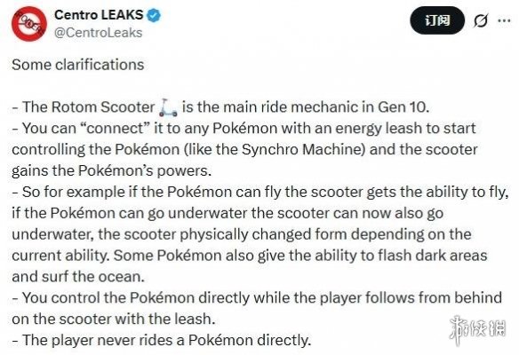 《宝可梦》第十世代最新泄露显示,其标志性骑行机制将采用新型洛托姆滑板车,可通过“能量纽带”连接特定宝可梦获取对应能力,如飞行系宝可梦赋予滑翔能力,水系宝可梦支持潜水和破浪。