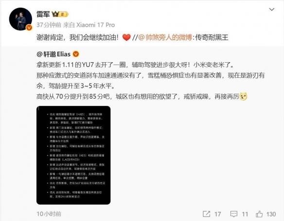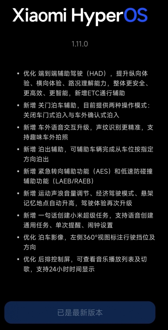 科技博主轩邈Elias近日将其小米YU7的系统升级至HyperOS 1.11.0,并体验了小米端到端大模型辅助驾驶系统HAD。他在分享中表示,新版辅助驾驶的进步非常明显,整体表现更加成熟稳重,“小米变老米了”。
