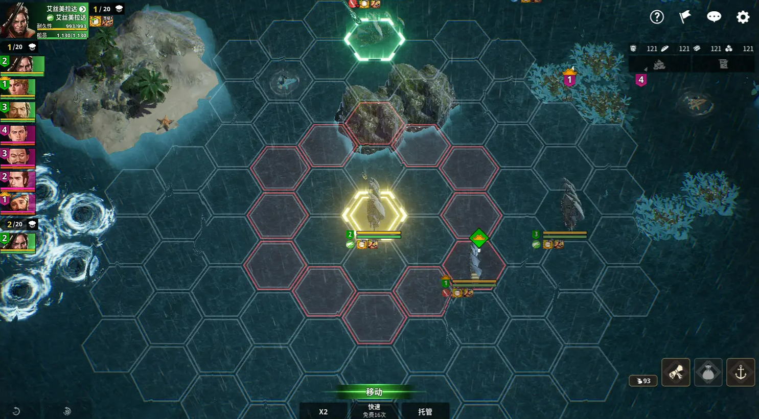 战斗正式开始之后,系统会把你带到一个专属的战斗地图,这就会是你和敌舰对决的地方,这个地方有六角形的格子,舰队和敌舰会分别站在不同的位置,进行回合制的对决。每个回合顺序是根据舰队的机动力来决定的,大家可以在画面上方看到行动的顺序。过程中,船员的战斗效果也会自动触发,越多相同效果的船员,效果越强。大家可以通过菜单查看这些效果,看看怎么去赢得战斗。