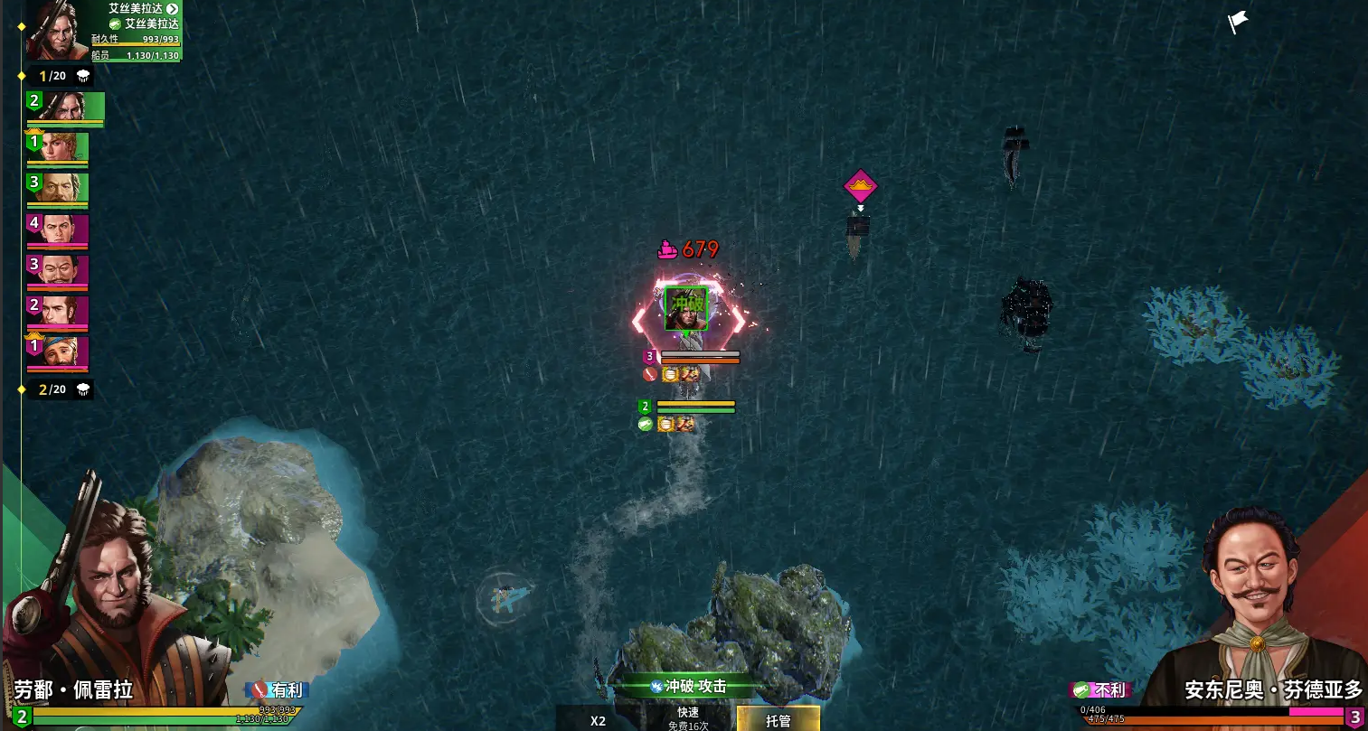 战斗中还有一个很有意思的设定,就是战斗地图会根据海域的不同,加入一些特殊的地形和漂浮物,这些因素会影响你舰队的移动,每个各自有不同的效果,像限制移动或增减属性等等。在战斗过程中,你的舰队可以使用一些快捷技术,这些提前设置好的话,战斗的时候就能马上使用。若是你更换了船只,就需要记得重新设置了。