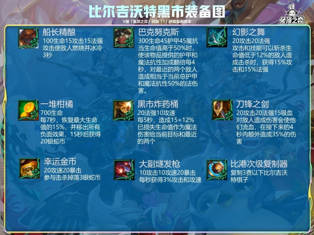 云顶之弈 S16版本 英雄联盟 传奇主题,在新赛季会增加很多新的羁绊和棋子,还有不少老羁绊,老英雄的回归,那么有不少小伙伴好奇新赛季有哪些装备,那么下面就给大家带来s16比尔吉沃特黑市装备一览图。