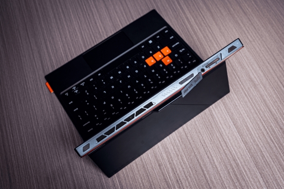 游侠 X1 Air的外观并没有走浮夸的路线,只用一身深灰色机身打底,再以利落的线条勾勒轮廓,由CNC工艺打造的金属切边精细锐利,在光线的照耀下显现出独特而又高级的金属质感,其机身背板也经过磨砂处理,触感温润细腻,近看细节能够感受到暗黑系风格带来的那份沉稳大气。屏幕背板的边缘还镶嵌着一块赤红色棱形的RGB灯效,与旁边散布的网状散热孔拼接在一起,黑红撞色的视觉效果十分炫酷华丽,未来科技感十足。