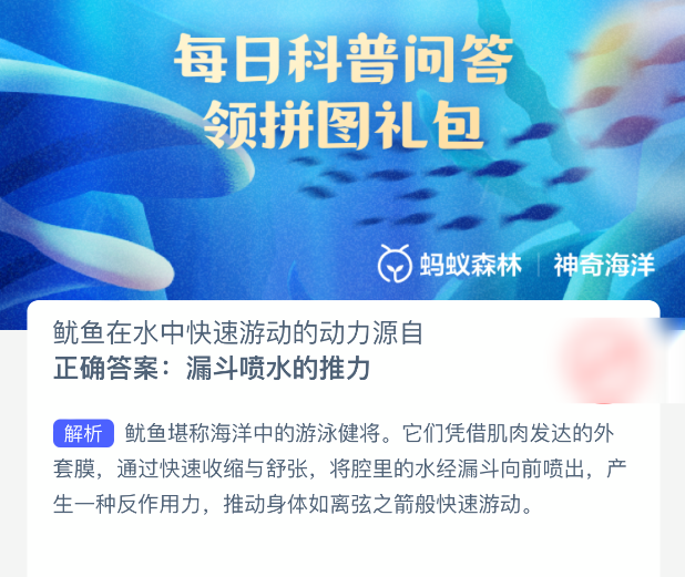 鱿鱼在水中快速游动的动力源自?【神奇海洋】11月17日新题目已开答!正确答案现已公布,点击领取拼图,一起为修复海洋生态贡献力量!今日正确答案是:【漏斗喷水的推力】。鱿鱼在水中快速游动的动力源自漏斗喷水的推力。